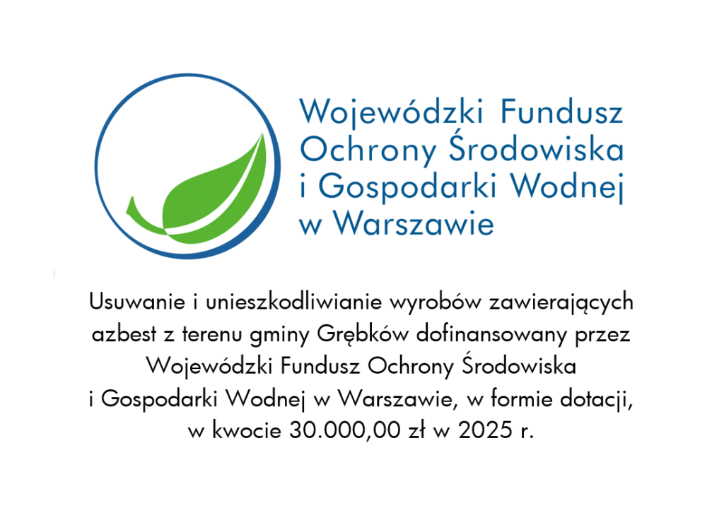 W dniu 7 sierpnia 2025 r. w siedzibie Wojewódzkiego Funduszu Ochrony Środowiska i Gospodarki Wodnej w Warszawie Pan Bogdan Doliński – Wójt Gminy Grębków oraz Pani Monika Roguska – Skarbnik podpisali umowę z Prezesem Zarządu Panem Zbigniewem Deptułą reprezentującym Fundusz na realizację zadania „Usuwanie i unieszkodliwianie wyrobów zawierających azbest z terenu Gminy Grębków”.